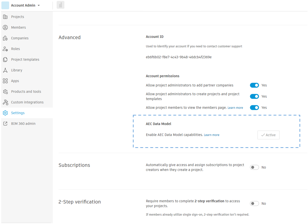 Before using the AEC Data Model API, it must be activated in your ACC account by your ACC Account Administrator. Contact your admin and request that they activate the AEC Data Model for your account. The admin can do this by going to Settings in the Account Admin page and toggling the "Enable AEC Data Model capabilities" option. It is not active by default. You can follow the complete onboarding guide for detailed steps.